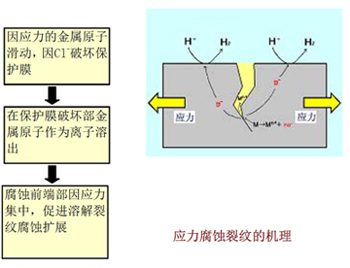 在較大的應(yīng)力作用下,金屬材料的原子處?kù)恫环€(wěn)定的高能狀態(tài),在特定的腐蝕介質(zhì)作用下,原子容易失去電子而使材料遭受腐蝕, 進(jìn)而發(fā)生脆裂,即產(chǎn)生微裂紋;由於微裂紋的應(yīng)力集中效應(yīng),使材料的脆裂得以快速擴(kuò)大,最終導(dǎo)致材料斷裂,腐蝕機(jī)理見圖1。