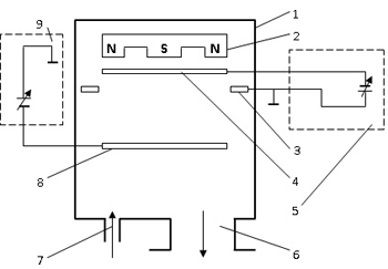 1—真空室;2—永久磁鐵;3—磁控陽極;4—磁控靶;5—磁控電源;