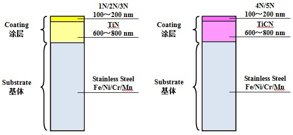 IPG以高硬度(表面維氏硬度可達(dá)2000 HV(25gf)以上)、高耐磨蝕性能、第一個(gè)產(chǎn)業(yè)化並廣泛應(yīng)用的金黃色硬質(zhì)薄膜材料TiN塗 層作為底層,厚度為600~800 nm,再在TiN塗層上鍍覆一層金(Au)含量≥18K、厚度為100~200 nm的1N色、2N色或3N色的納米金 塗層;而IPRG則是以同樣高硬度(表面維氏硬度可達(dá)2400 HV(25gf)以上)、高耐磨蝕性能的紅(粉)色的硬質(zhì)TiCN塗層 作為底層,厚度為600~800 nm,再在TiCN塗層上鍍覆一層金(Au)含量≥18K、厚度為100~200 nm的4N色或5N色的納米玫瑰金 (粉)金塗層。IPG或IPRG以金黃色的TiN或紅(粉)色的TiCN硬質(zhì)薄膜為底層,既節(jié)省了用金量,又提高了塗層的耐磨及耐蝕 性能,從而極大地提高了塗層的使用壽命。